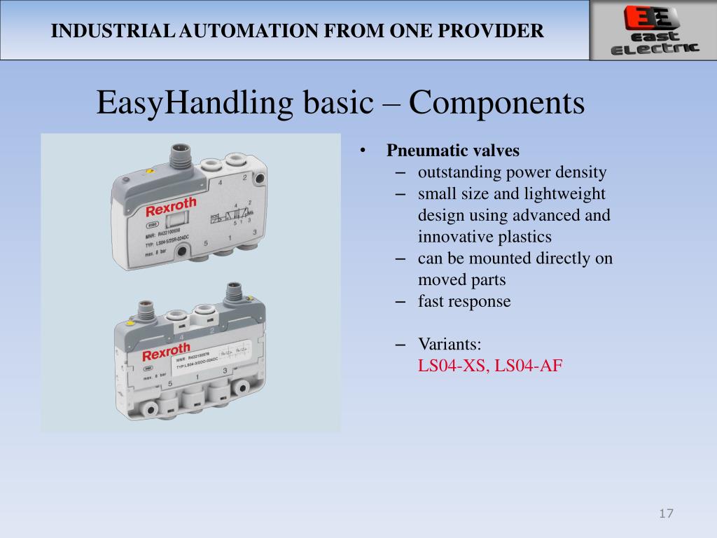 INDUSTRIAL AUTOMATION FROM ONE PROVIDER EasyHandling basic – Components • Pneumatic valves • outstanding power density • small size and lightweight design using advanced and innovative plastics • can be mounted directly on moved parts • fast response • Variants: LS04-XS, LS04-AF