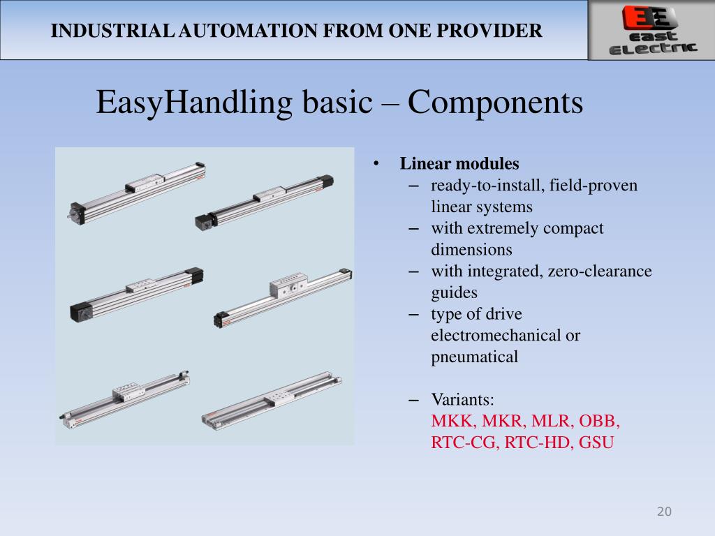 INDUSTRIAL AUTOMATION FROM ONE PROVIDER EasyHandling basic – Components • Linear modules • ready-to-install, field-proven linear systems • with extremely compact dimensions • with integrated, zero-clearance guides • type of drive electromechanical or pneumatical • Variants: MKK, MKR, MLR, OBB, RTC-CG, RTC-HD, GSU