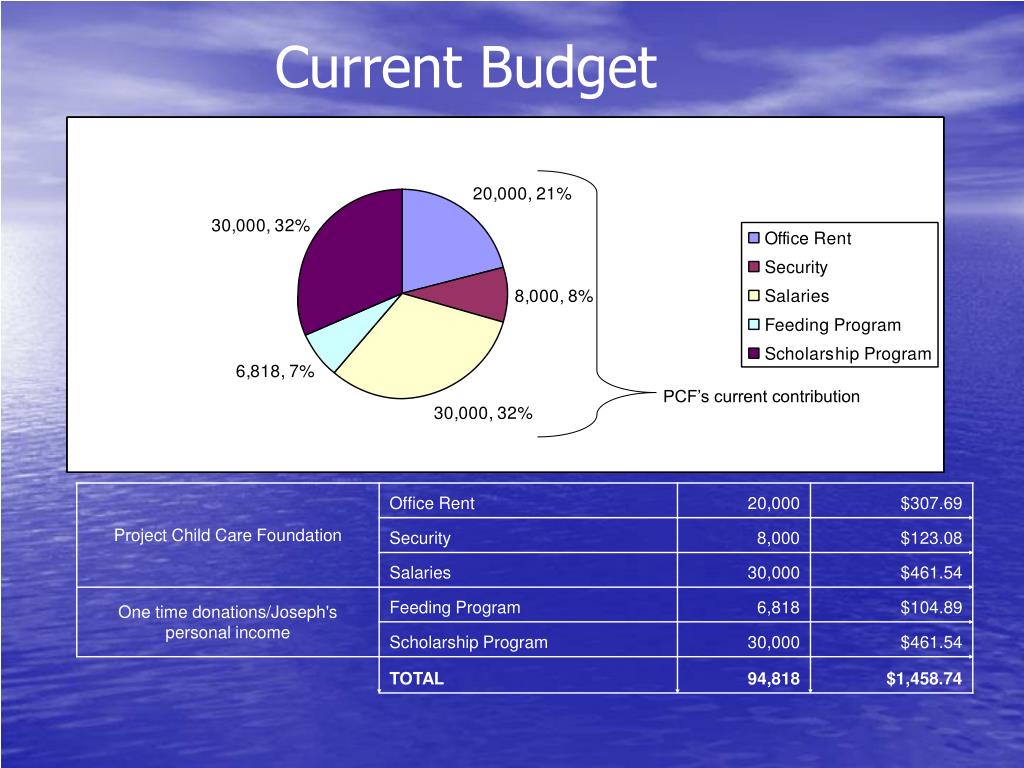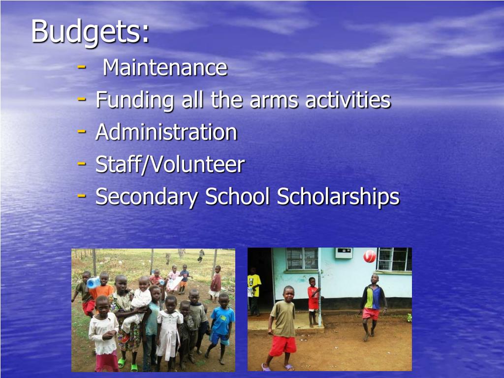 Budgets: • Maintenance • Funding all the arms activities • Administration • Staff/Volunteer • Secondary School Scholarships