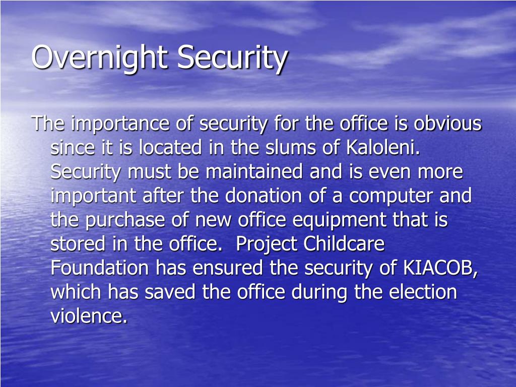Overnight Security The importance of security for the office is obvious since it is located in the slums of Kaloleni. Security must be maintained and is even more important after the donation of a computer and the purchase of new office equipment that is stored in the office. Project Childcare Foundation has ensured the security of KIACOB, which has saved the office during the election violence.