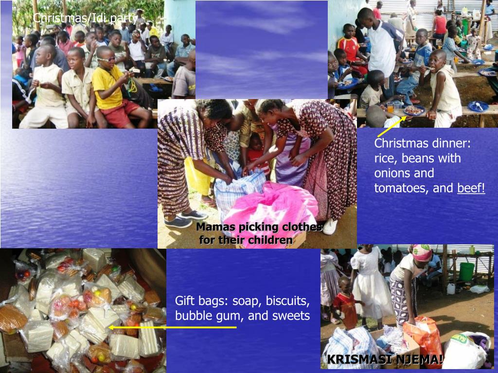 Christmas/Idi party Christmas dinner: rice, beans with onions and tomatoes, and beef! Mamas picking clothes for their children Gift bags: soap, biscuits, bubble gum, and sweets KRISMASI NJEMA!