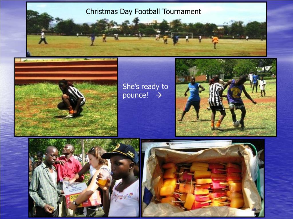Extra Activities KIACOB will occasionally hold special celebrations for the children. This allows the children to invite their friends to KIACOB who are not registered. The children are fed food donated by local businesses. Donated clothes are given out in an organized manner to the children and the ‘mamas’. They are also given the chance to do arts and crafts donated by outside sources. 2007 activities included: - launch of feeding programme - ‘Bon voyage’ party for foreign sponsor - Christmas/Idi party - Football (soccer) tournament in town stadium