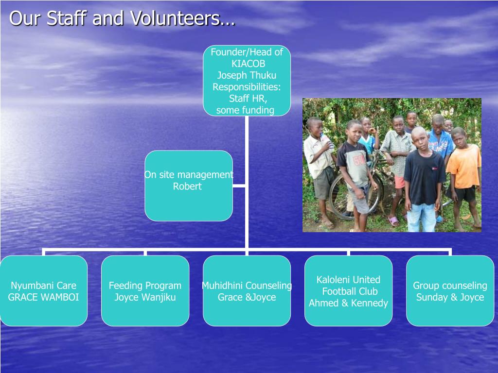Future Plans/Priorities Top priorities other than the ones that are currently funded include • Salaries for volunteers to ensure commitment • Office supplies/stationary funding • Pen pal Football/Soccer teams • Office Library • Funding for feeding programs • Funding for scholarship program • VCT (HIV testing) centre within KIACOB office