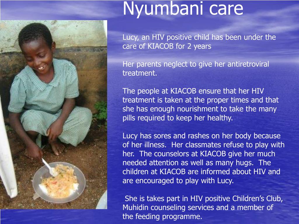 Nyumbani care Lucy, an HIV positive child has been under the care of KIACOB for 2 years Her parents neglect to give her antiretroviral treatment. The people at KIACOB ensure that her HIV treatment is taken at the proper times and that she has enough nourishment to take the many pills required to keep her healthy. Lucy has sores and rashes on her body because of her illness. Her classmates refuse to play with her. The counselors at KIACOB give her much needed attention as well as many hugs. The children at KIACOB are informed about HIV and are encouraged to play with Lucy. She is takes part in HIV positive Children’s Club, Muhidin counseling services and a member of the feeding programme.