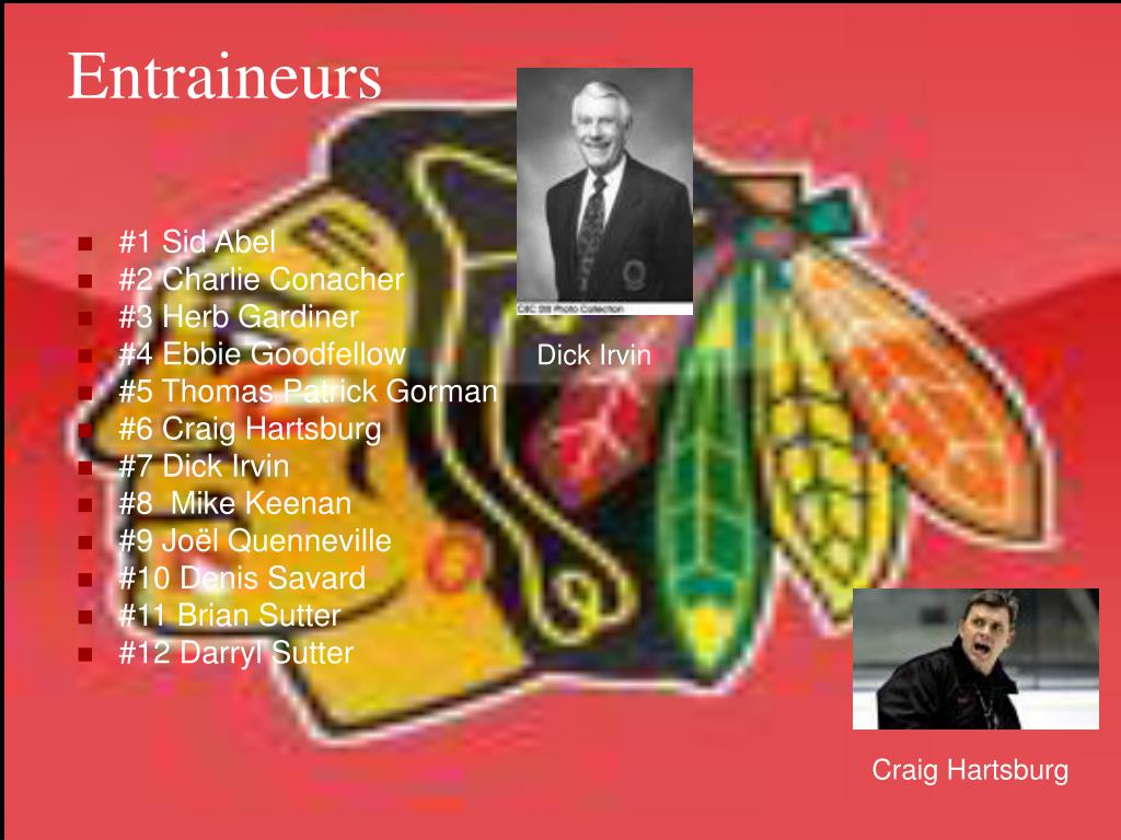Entraineurs • #1 Sid Abel • #2 Charlie Conacher • #3 Herb Gardiner • #4 Ebbie Goodfellow • #5 Thomas Patrick Gorman • #6 Craig Hartsburg • #7 Dick Irvin • #8 Mike Keenan • #9 Joël Quenneville • #10 Denis Savard • #11 Brian Sutter • #12 Darryl Sutter Dick Irvin Craig Hartsburg