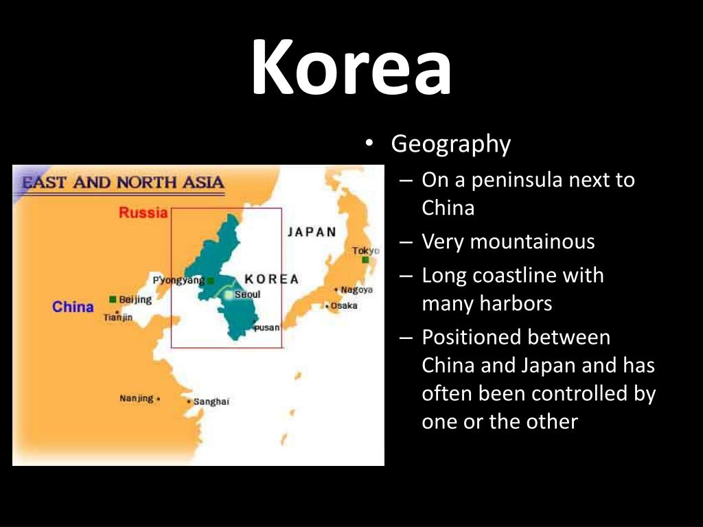 Korea • Geography • On a peninsula next to China • Very mountainous • Long coastline with many harbors • Positioned between China and Japan and has often been controlled by one or the other