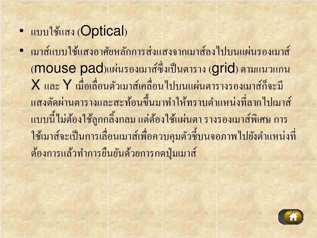 แบบใช้แสง (Optical) • เมาส์แบบใช้แสงอาศัยหลักการส่งแสงจากเมาส์ลงไปบนแผ่นรองเมาส์ (mouse pad)แผ่นรองเมาส์ซึ่งเป็นตาราง (grid) ตามแนวแกน X และ Y เมื่อเลื่อนตัวเมาส์เคลื่อนไปบนแผ่นตารางรองเมาส์ก็จะมีแสงตัดผ่านตารางและสะท้อนขึ้นมาทำให้ทราบตำแหน่งที่ลากไปเมาส์แบบนี้ไม่ต้องใช้ลูกกลิ้งกลม แต่ต้องใช้แผ่นตารางรองเมาส์พิเศษ การใช้เมาส์จะเป็นการเลื่อนเมาส์เพื่อควบคุมตัวชี้บนจอภาพไปยังตำแหน่งที่ต้องการแล้วทำการยืนยันด้วยการกดปุ่มเมาส์