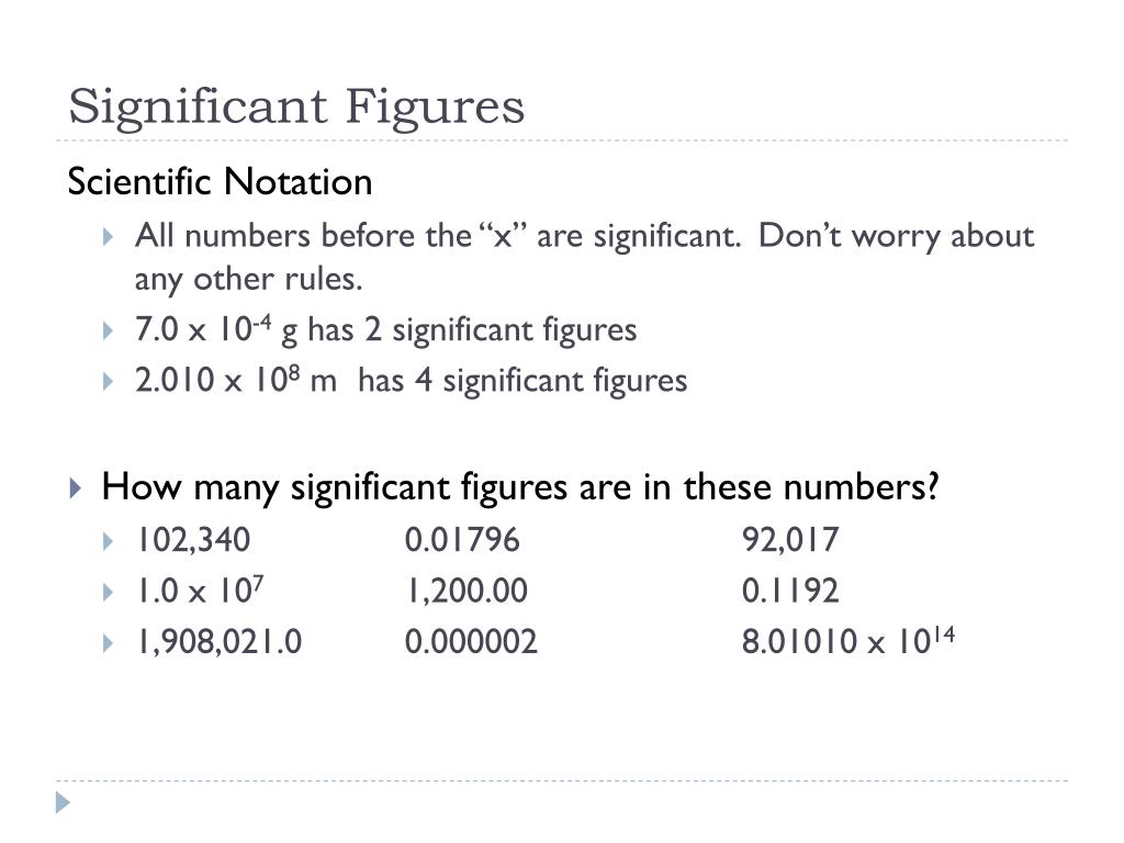 Significant Figures Scientific Notation • All numbers before the “x” are significant. Don’t worry about any other rules. • 7.0 x 10-4 g has 2 significant figures • 2.010 x 108 m has 4 significant figures • How many significant figures are in these numbers? • 102,340 0.01796 92,017 • 1.0 x 107 1,200.00 0.1192 • 1,908,021.0 0.000002 8.01010 x 1014