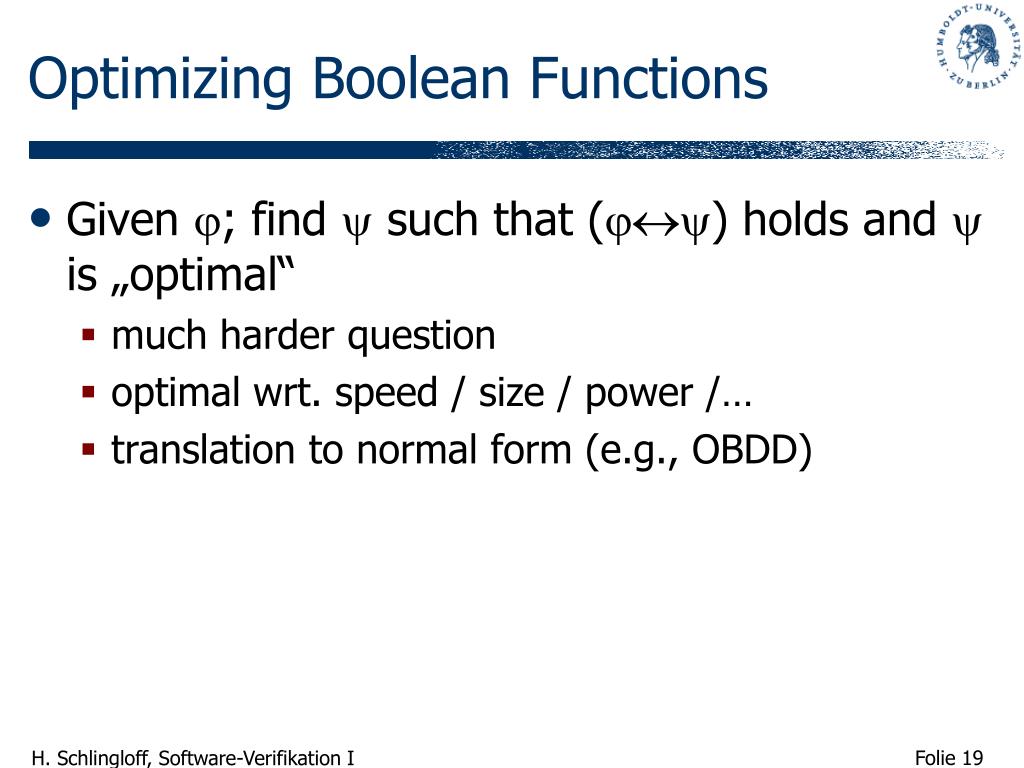 Optimizing Boolean Functions • Given ; find such that () holds and is „optimal“ • much harder question • optimal wrt. speed / size / power /… • translation to normal form (e.g., OBDD)