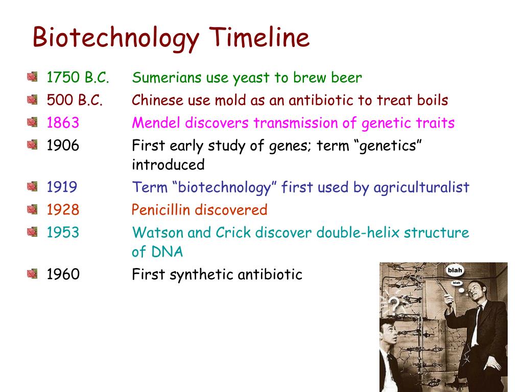 Biotechnology Timeline • 1750 B.C. Sumerians use yeast to brew beer • 500 B.C. Chinese use mold as an antibiotic to treat boils • 1863 Mendel discovers transmission of genetic traits • 1906 First early study of genes; term “genetics” introduced • 1919 Term “biotechnology” first used by agriculturalist • 1928 Penicillin discovered • 1953 Watson and Crick discover double-helix structure of DNA • 1960 First synthetic antibiotic
