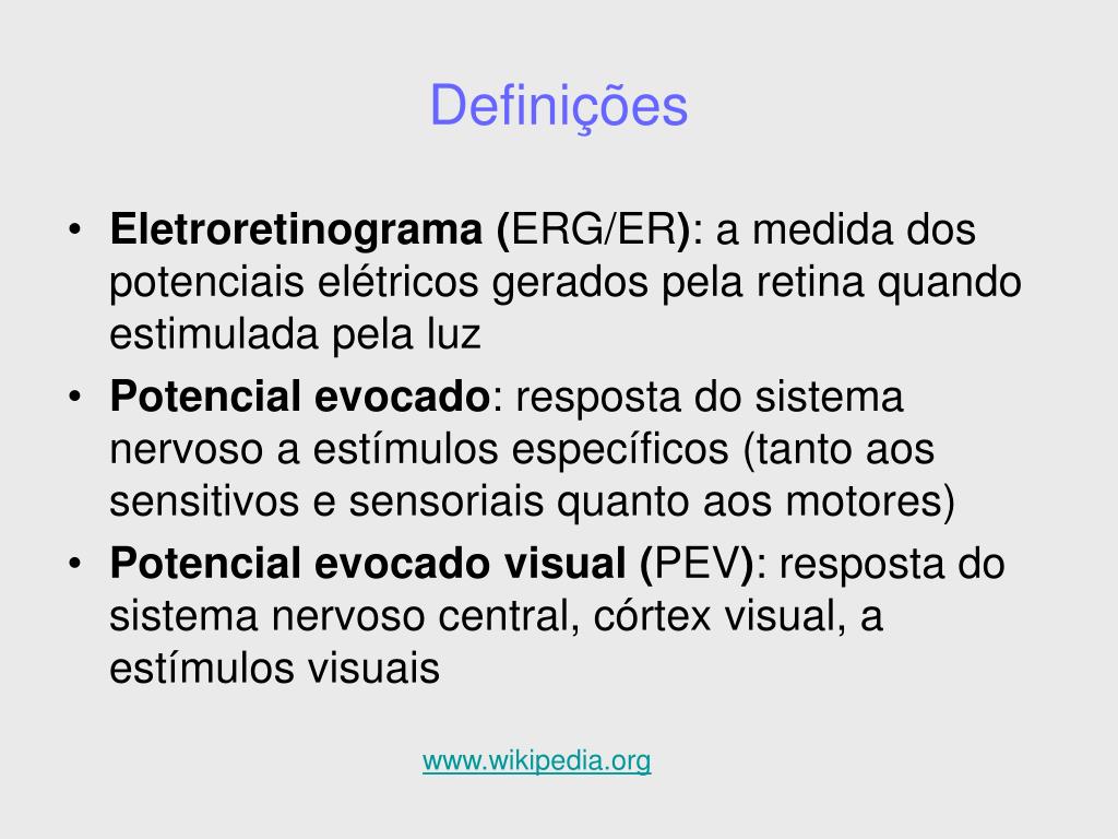 Definições • Eletroretinograma (ERG/ER): a medida dos potenciais elétricos gerados pela retina quando estimulada pela luz • Potencial evocado: resposta do sistema nervoso a estímulos específicos (tanto aos sensitivos e sensoriais quanto aos motores) • Potencial evocado visual (PEV): resposta do sistema nervoso central, córtex visual, a estímulos visuais www.wikipedia.org
