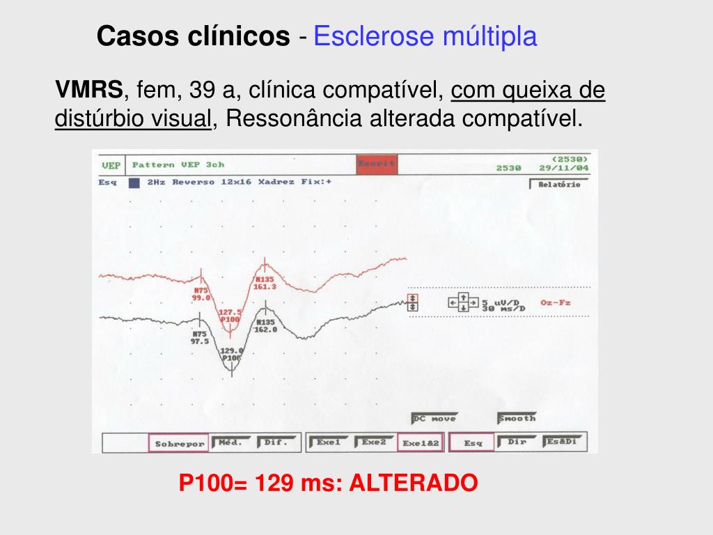 Casos clínicos -Esclerose múltipla VMRS, fem, 39 a, clínica compatível, com queixa de distúrbio visual, Ressonância alterada compatível. P100= 129 ms: ALTERADO