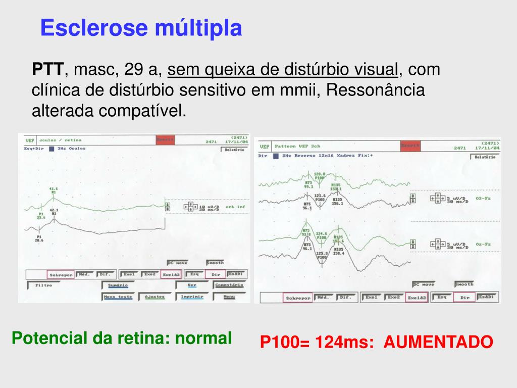 Esclerose múltipla PTT, masc, 29 a, sem queixa de distúrbio visual, com clínica de distúrbio sensitivo em mmii, Ressonância alterada compatível. Potencial da retina: normal P100= 124ms: AUMENTADO