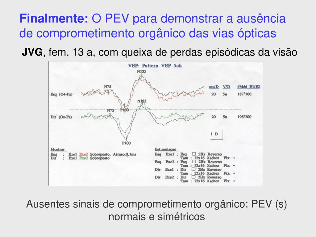 Finalmente: O PEV para demonstrar a ausência de comprometimento orgânico das vias ópticas JVG, fem, 13 a, com queixa de perdas episódicas da visão Ausentes sinais de comprometimento orgânico: PEV (s) normais e simétricos