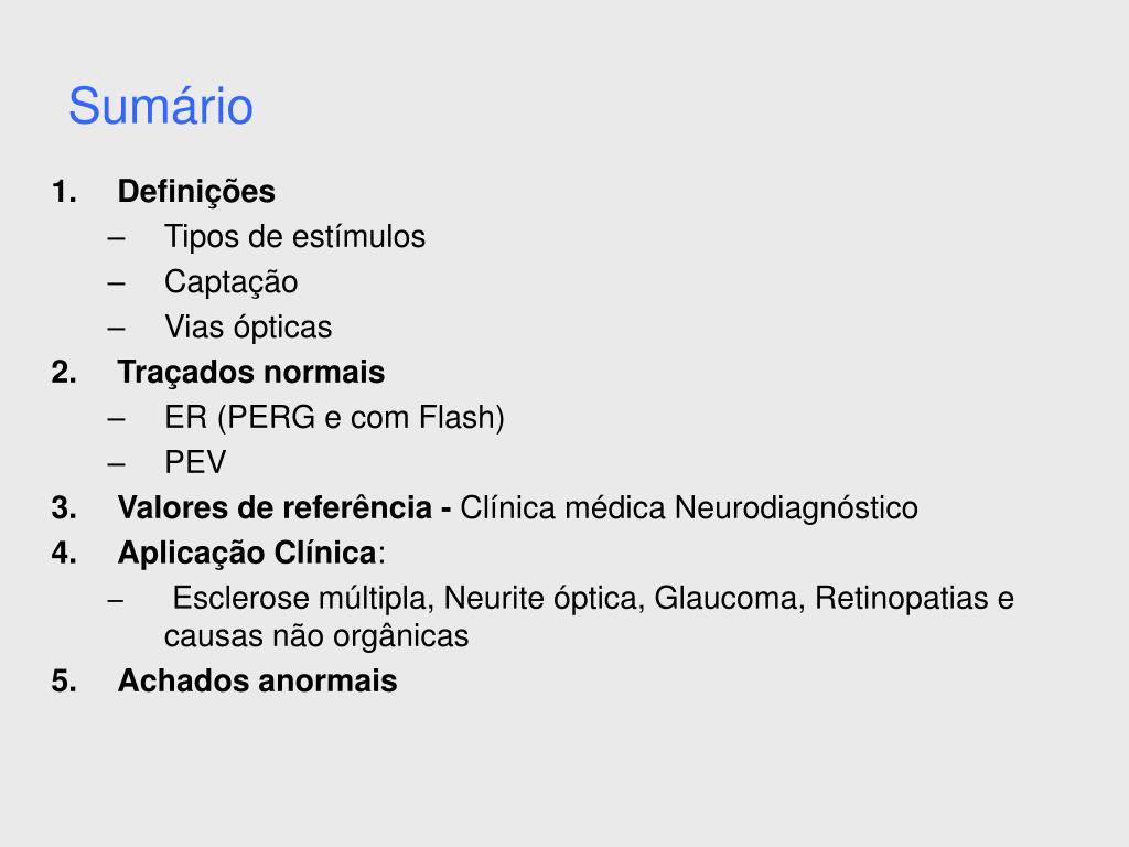 Sumário • Definições • Tipos de estímulos • Captação • Vias ópticas • Traçados normais • ER (PERG e com Flash) • PEV • Valores de referência - Clínica médica Neurodiagnóstico • Aplicação Clínica: • Esclerose múltipla, Neurite óptica, Glaucoma, Retinopatias e causas não orgânicas • Achados anormais
