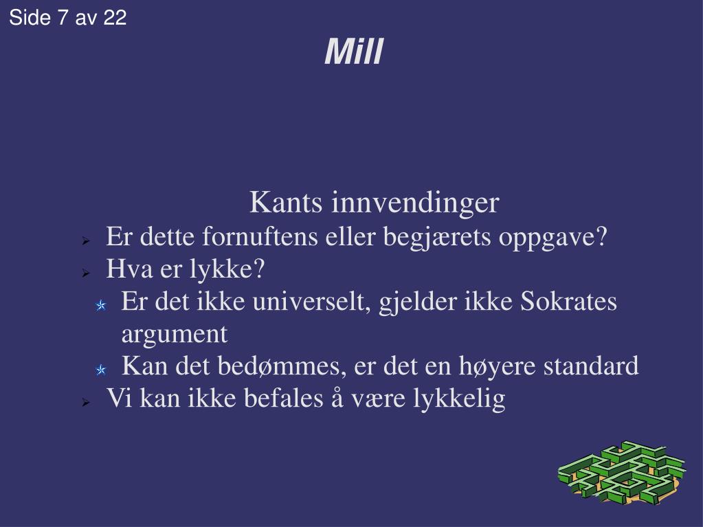 Mill Kants innvendinger Er dette fornuftens eller begjærets oppgave? Hva er lykke? Er det ikke universelt, gjelder ikke Sokrates argument Kan det bedømmes, er det en høyere standard Vi kan ikke befales å være lykkelig Side 7 av 22