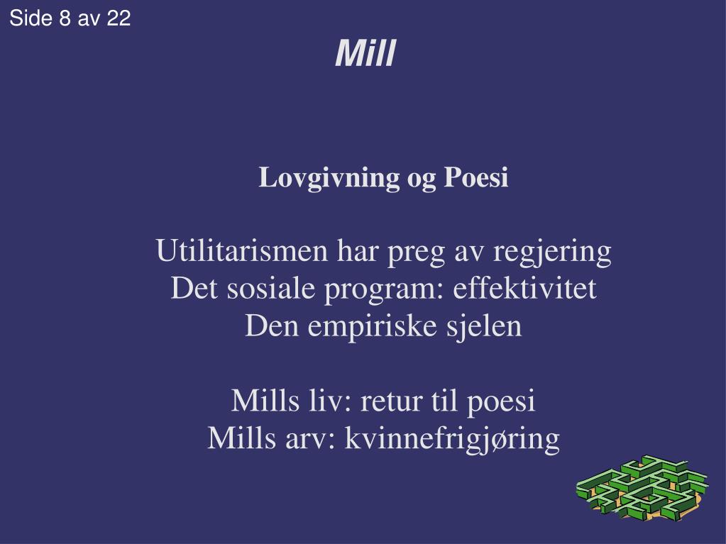 Side 8 av 22 Mill Lovgivning og Poesi Utilitarismen har preg av regjering Det sosiale program: effektivitet Den empiriske sjelen Mills liv: retur til poesi Mills arv: kvinnefrigjøring