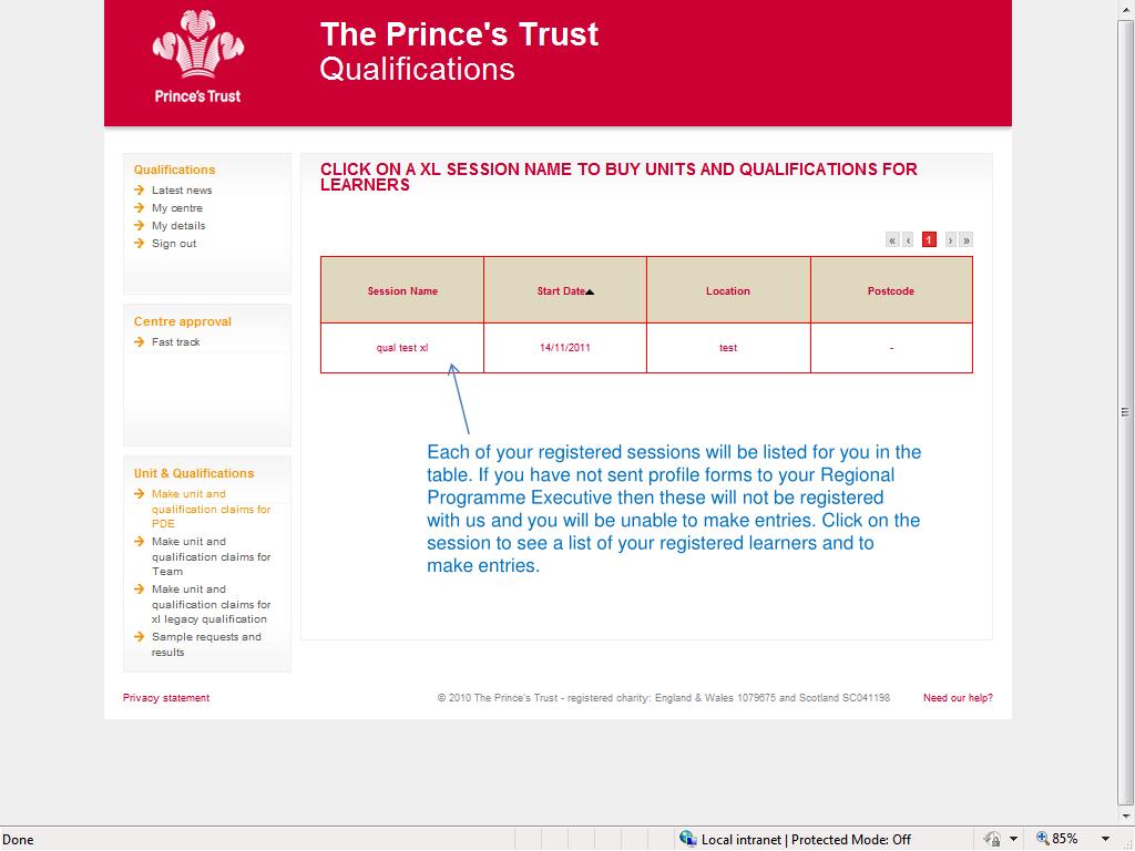 Each of your registered sessions will be listed for you in the table. If you have not sent profile forms to your Regional Programme Executive then these will not be registered with us and you will be unable to make entries. Click on the session to see a list of your registered learners and to make entries.
