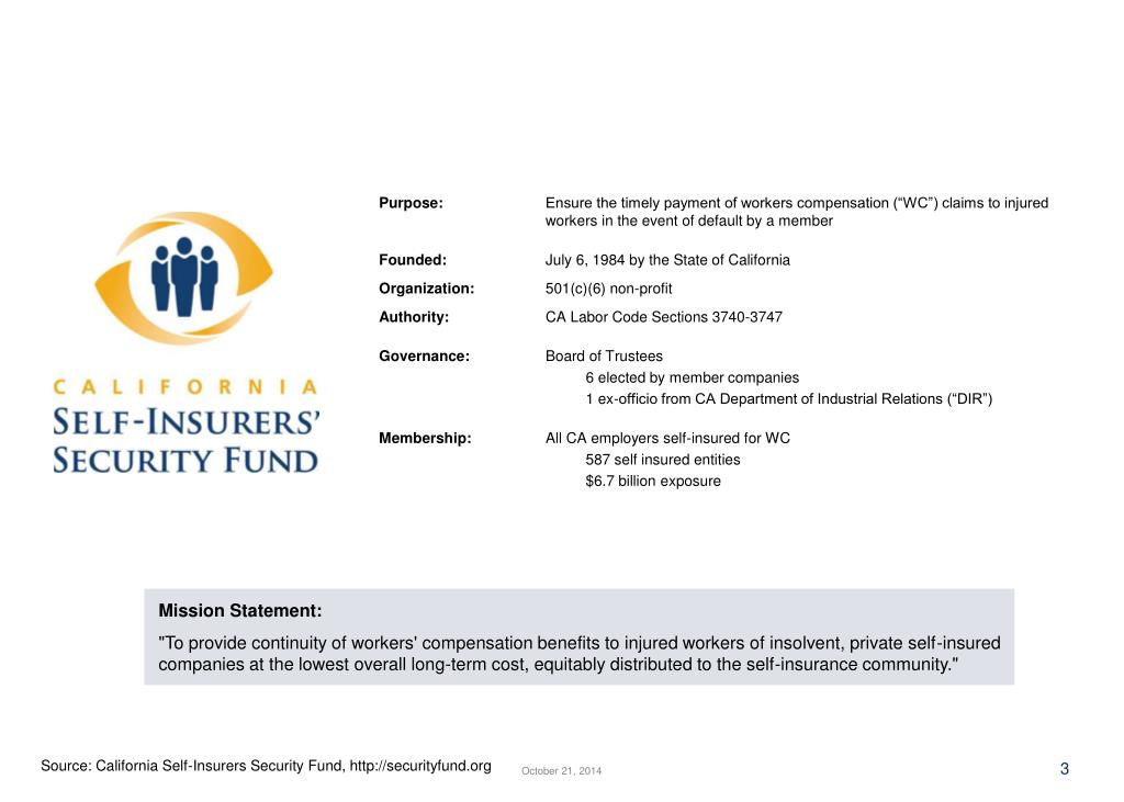 Mission Statement: "To provide continuity of workers' compensation benefits to injured workers of insolvent, private self-insured companies at the lowest overall long-term cost, equitably distributed to the self-insurance community." Source: California Self-Insurers Security Fund, http://securityfund.org