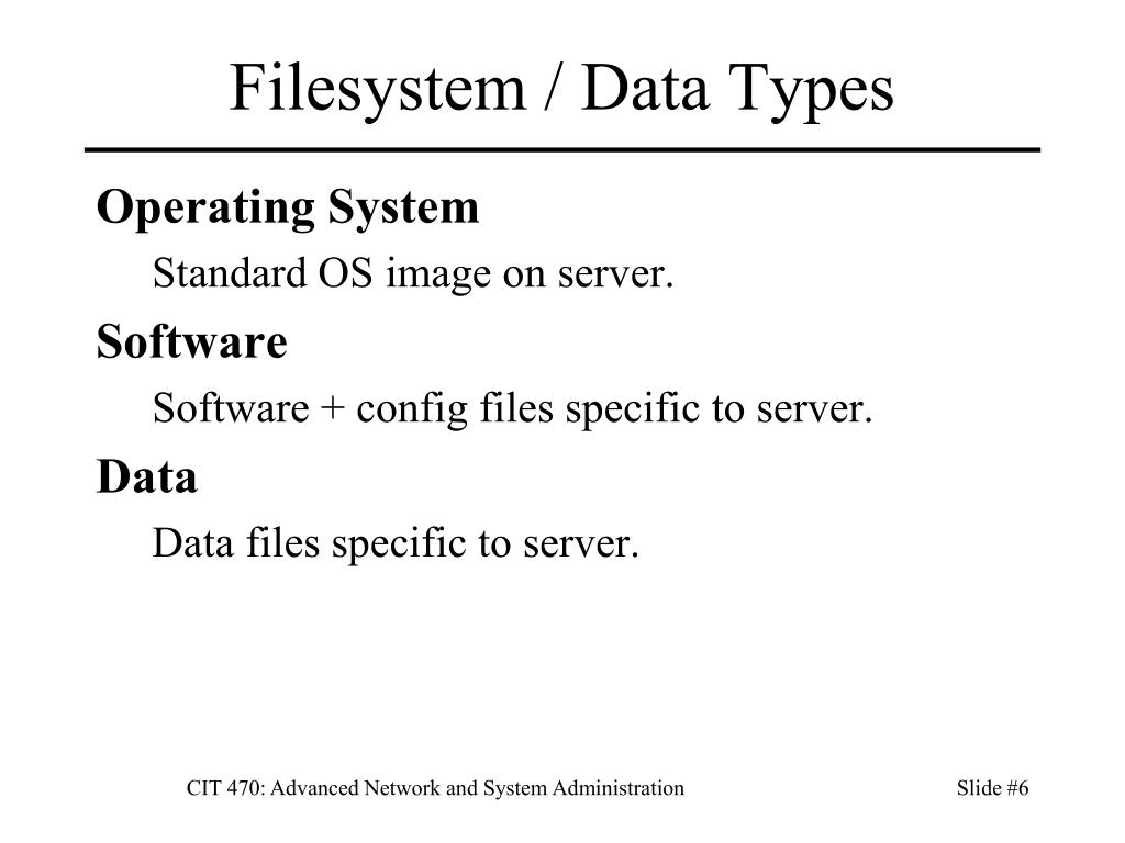 Filesystem / Data Types Operating System Standard OS image on server. Software Software + config files specific to server. Data Data files specific to server. CIT 470: Advanced Network and System Administration