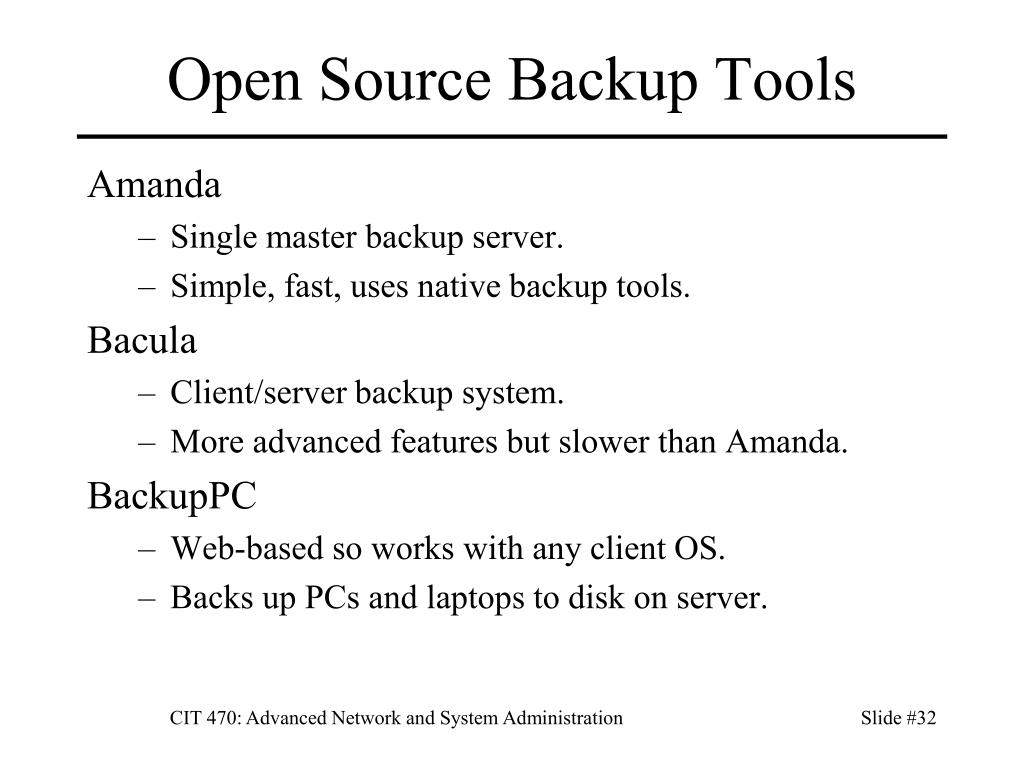 Open Source Backup Tools Amanda • Single master backup server. • Simple, fast, uses native backup tools. Bacula • Client/server backup system. • More advanced features but slower than Amanda. BackupPC • Web-based so works with any client OS. • Backs up PCs and laptops to disk on server. CIT 470: Advanced Network and System Administration