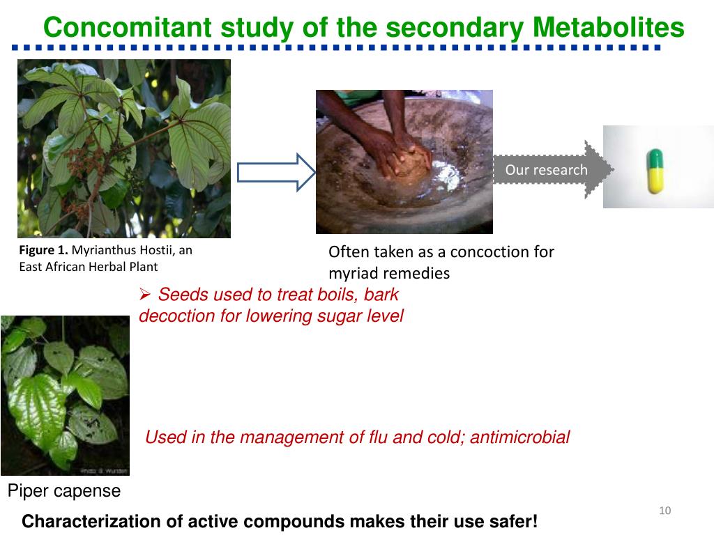 Our research Often taken as a concoction for myriad remedies Figure 1. Myrianthus Hostii, an East African Herbal Plant Concomitant study of the secondary Metabolites • Seeds used to treat boils, bark decoction for lowering sugar level Used in the management of flu and cold; antimicrobial Piper capense Characterization of active compounds makes their use safer!
