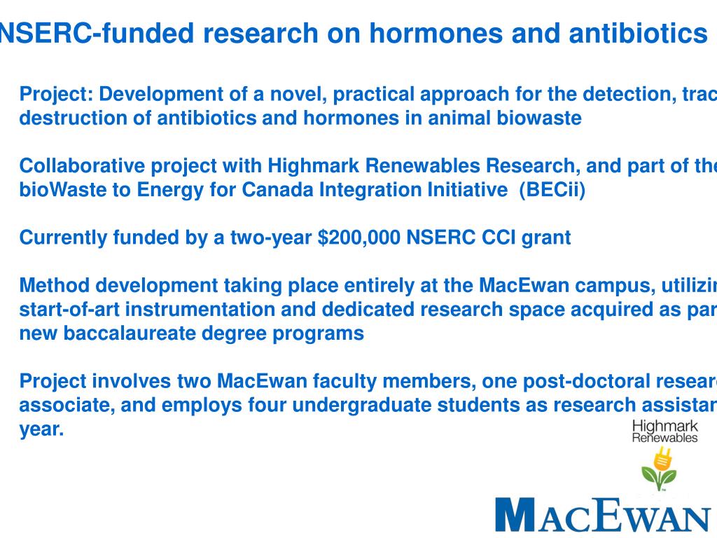 NSERC-funded research on hormones and antibiotics Project: Development of a novel, practical approach for the detection, tracing and destruction of antibiotics and hormones in animal biowaste Collaborative project with Highmark Renewables Research, and part of the larger bioWaste to Energy for Canada Integration Initiative (BECii) Currently funded by a two-year $200,000 NSERCCCI grant Method development taking place entirely at the MacEwan campus, utilizingstart-of-art instrumentation and dedicated research space acquired as part of the new baccalaureate degree programs Project involves two MacEwan faculty members, one post-doctoral researchassociate, and employs four undergraduate students as research assistants eachyear.