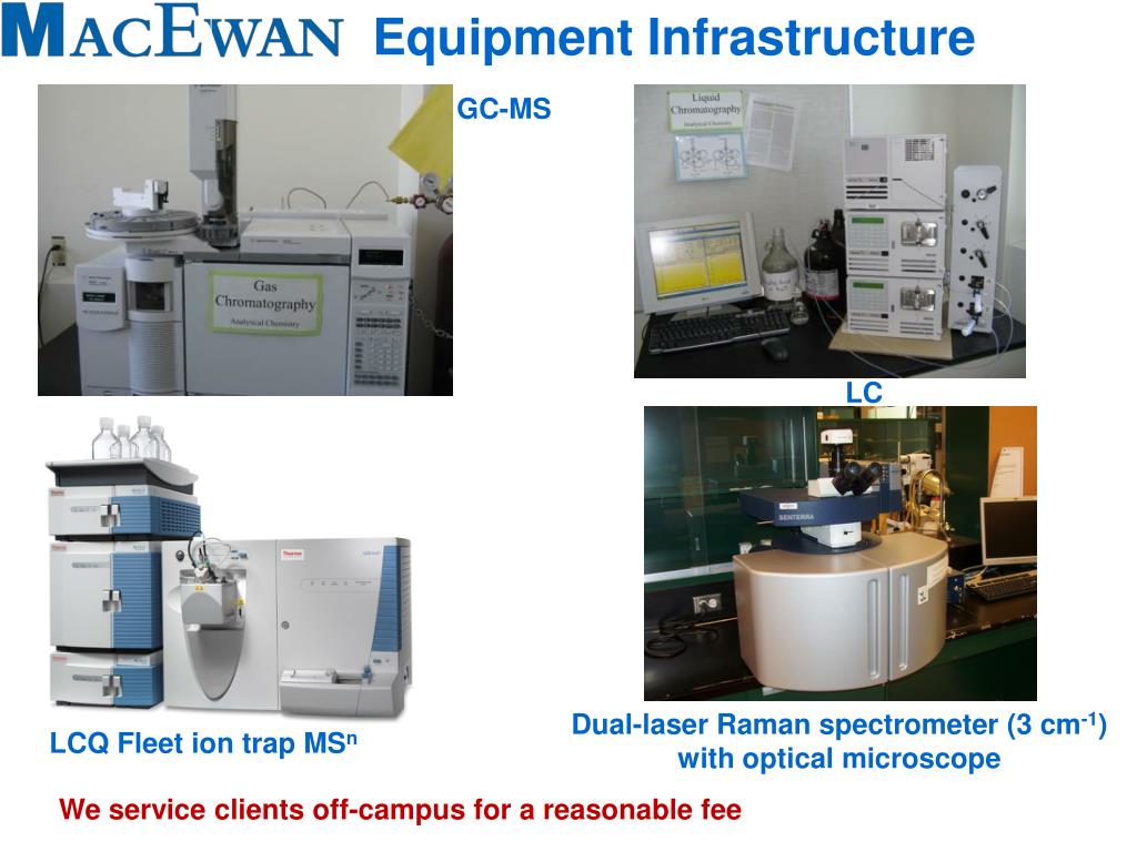 Equipment Infrastructure GC-MS LC Dual-laser Raman spectrometer (3 cm-1) with optical microscope LCQ Fleet ion trap MSn We service clients off-campus for a reasonable fee