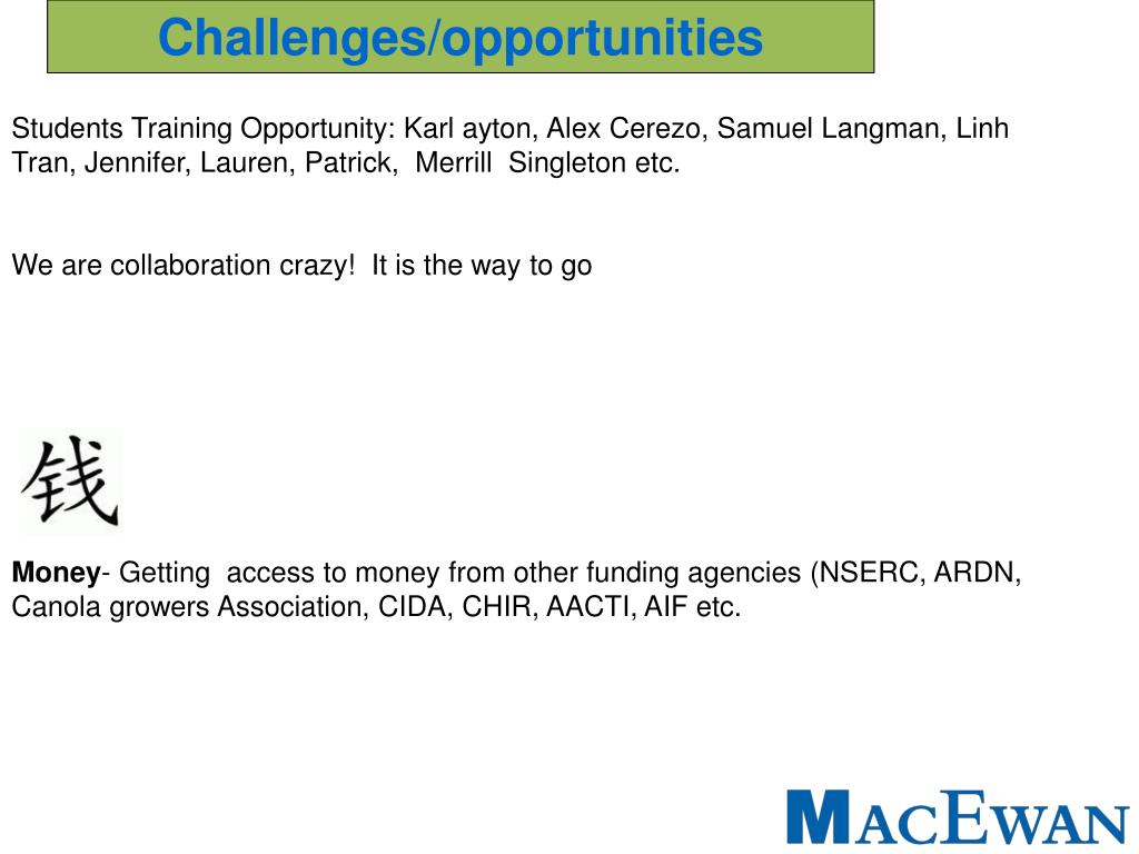 Challenges/opportunities Students Training Opportunity: Karl ayton, Alex Cerezo, Samuel Langman, Linh Tran, Jennifer, Lauren, Patrick, Merrill Singletonetc. We are collaboration crazy! It is the way to go Money- Getting access to money from other funding agencies (NSERC, ARDN, Canola growers Association, CIDA, CHIR, AACTI, AIF etc.