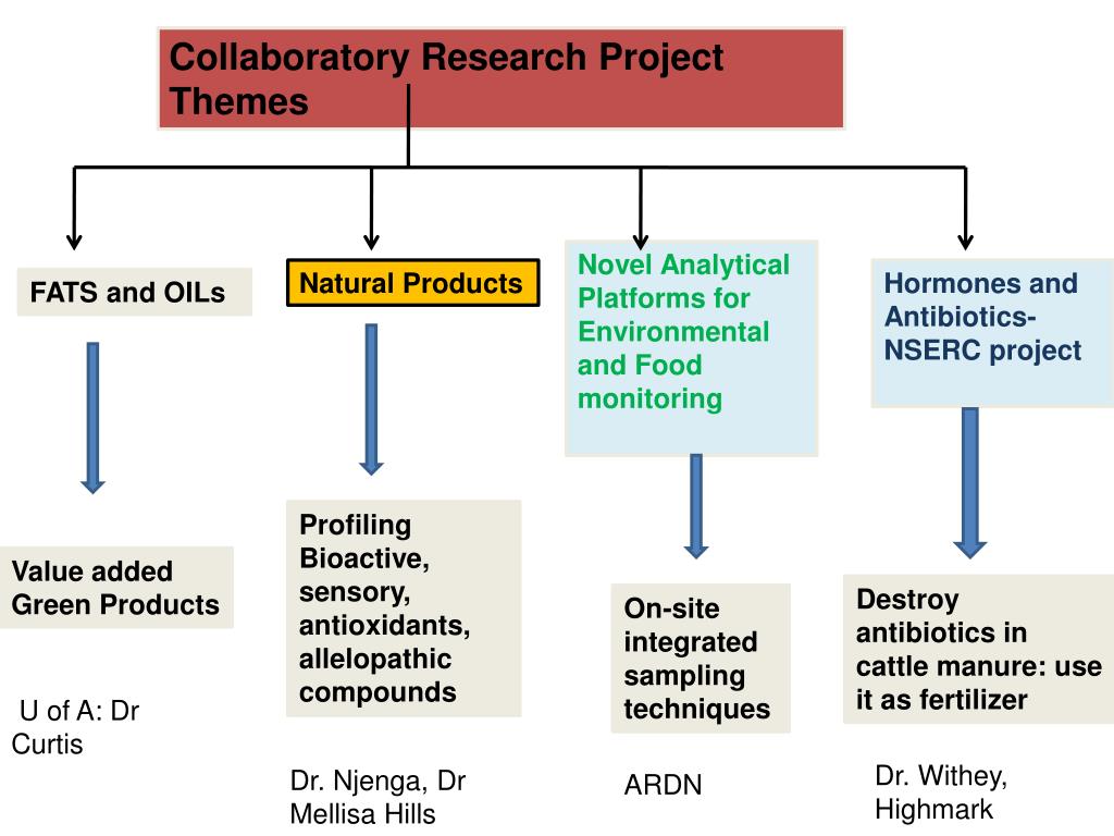 Collaboratory Research Project Themes • Novel Analytical Platforms for Environmental and Food monitoring Natural Products • Hormones and Antibiotics-NSERC project FATS and OILs Profiling Bioactive, sensory, antioxidants, allelopathic compounds Value added Green Products Destroy antibiotics in cattle manure: use it as fertilizer On-site integrated sampling techniques U of A: Dr Curtis Dr. Withey, Highmark Dr. Njenga, Dr Mellisa Hills ARDN