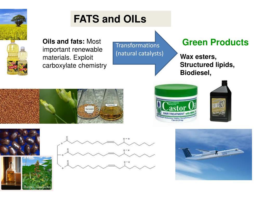 FATS and OILs Transformations (natural catalysts) Green Products Oils and fats: Most important renewable materials. Exploit carboxylate chemistry Wax esters, Structured lipids, Biodiesel,