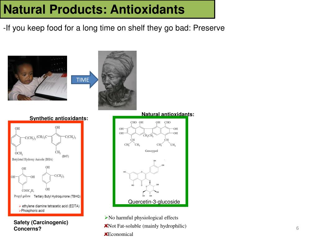 Natural Products: Antioxidants • If you keep food for a long time on shelf they go bad: Preserve • Natural antioxidants: • Synthetic antioxidants: TIME Quercetin-3-glucoside • No harmful physiological effects • Not Fat-soluble (mainly hydrophilic) • Economical Safety (Carcinogenic) Concerns?