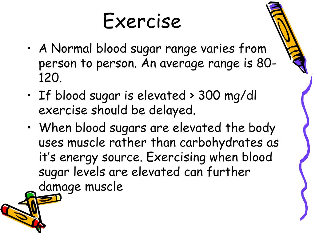 Exercise • A Normal blood sugar range varies from person to person. An average range is 80-120. • If blood sugar is elevated > 300 mg/dl exercise should be delayed. • When blood sugars are elevated the body uses muscle rather than carbohydrates as it’s energy source. Exercising when blood sugar levels are elevated can further damage muscle