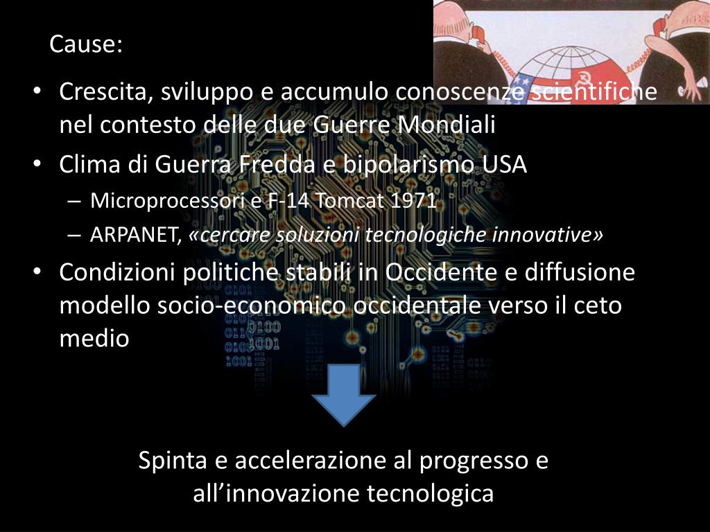 Cause: • Crescita, sviluppo e accumulo conoscenze scientifiche nel contesto delle due Guerre Mondiali • Clima di Guerra Fredda e bipolarismo USA • Microprocessori e F-14 Tomcat 1971 • ARPANET, «cercare soluzioni tecnologiche innovative» • Condizioni politiche stabili in Occidente e diffusione modello socio-economico occidentale verso il ceto medio Spinta e accelerazione al progresso e all’innovazione tecnologica