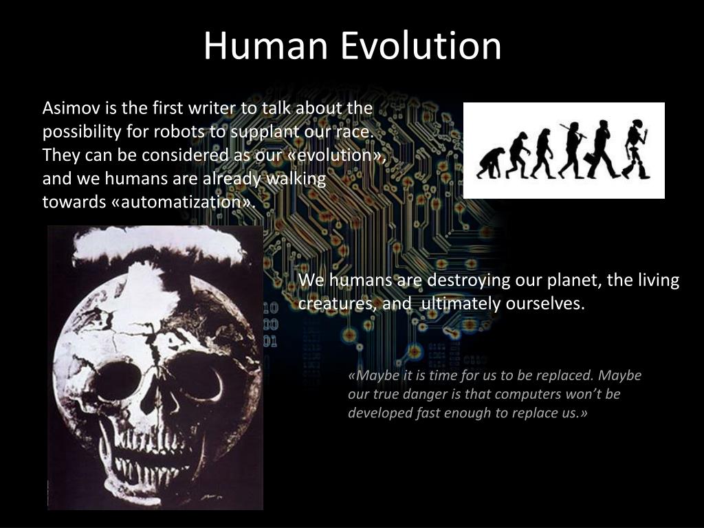 Human Evolution Asimov is the first writer to talk about the possibility for robots to supplantour race. They can be consideredasour «evolution», and wehumans are alreadywalkingtowards«automatization». Wehumans are destroyingourplanet, the living creatures, and ultimatelyourselves. «Maybeitis time for us to be replaced. Maybeourtruedangeristhatcomputerswon’t be developed fast enough to replaceus.»
