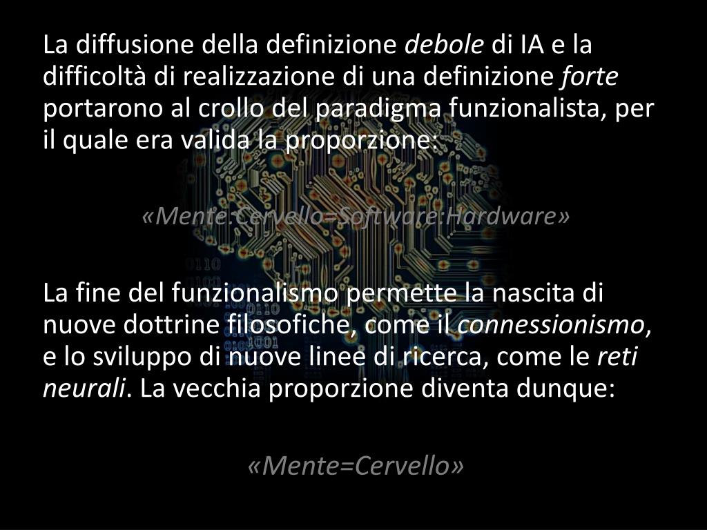 La diffusione della definizione debole di IA e la difficoltà di realizzazione di una definizione forte portarono al crollo del paradigma funzionalista, per il quale era valida la proporzione: «Mente:Cervello=Software:Hardware» La fine del funzionalismo permette la nascita di nuove dottrine filosofiche, come il connessionismo, e lo sviluppo di nuove linee di ricerca, come le reti neurali. La vecchia proporzione diventa dunque: «Mente=Cervello»
