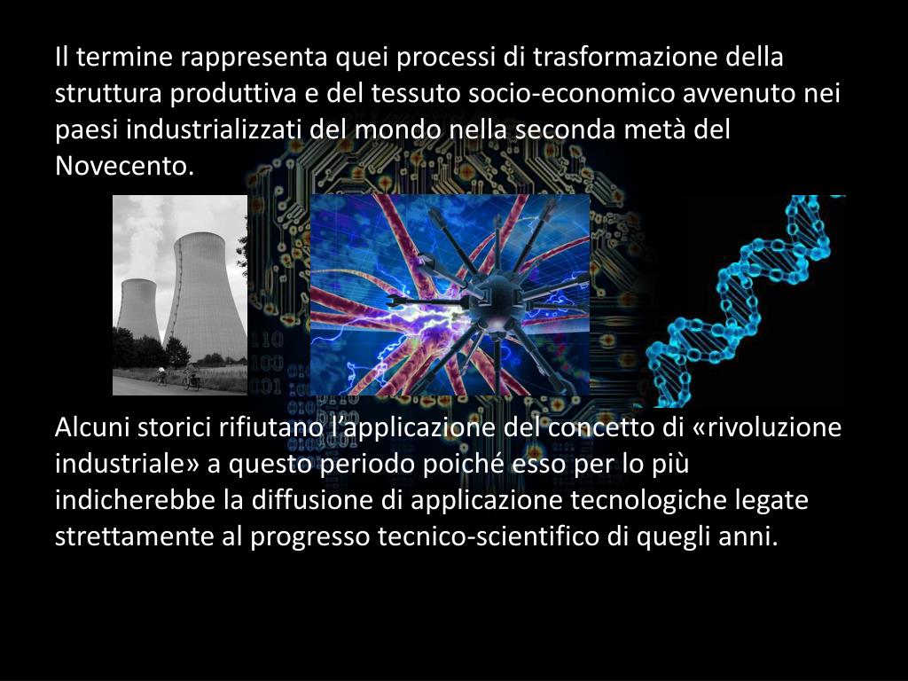 Il termine rappresenta quei processi di trasformazione della struttura produttiva e del tessuto socio-economico avvenuto nei paesi industrializzati del mondo nella seconda metà del Novecento. Alcuni storici rifiutano l’applicazione del concetto di «rivoluzione industriale» a questo periodo poiché esso per lo più indicherebbe la diffusione di applicazione tecnologiche legate strettamente al progresso tecnico-scientifico di quegli anni.