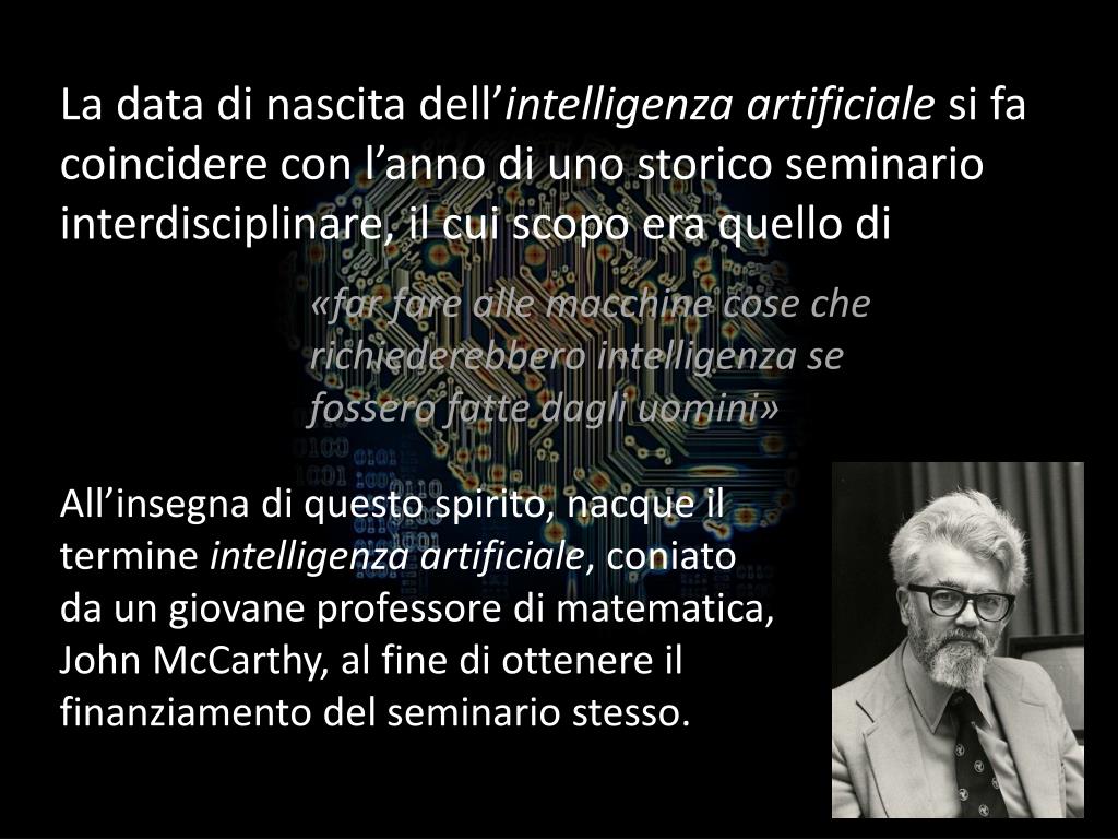 La data di nascita dell’intelligenza artificiale si fa coincidere con l’anno di uno storico seminario interdisciplinare, il cui scopo era quello di «far fare alle macchine cose che richiederebbero intelligenza se fossero fatte dagli uomini» All’insegna di questo spirito, nacque il termine intelligenza artificiale, coniato da un giovane professore di matematica, John McCarthy, al fine di ottenere il finanziamento del seminario stesso.