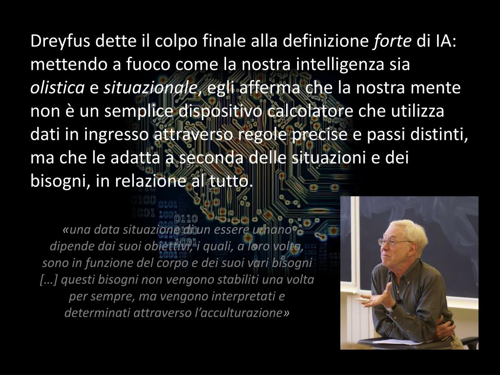 Dreyfus dette il colpo finale alla definizione forte di IA: mettendo a fuoco come la nostra intelligenza sia olistica e situazionale, egli afferma che la nostra mente non è un semplice dispositivo calcolatore che utilizza dati in ingresso attraverso regole precise e passi distinti, ma che le adatta a seconda delle situazioni e dei bisogni, in relazione al tutto. «una data situazione di un essere umano dipende dai suoi obiettivi, i quali, a loro volta, sono in funzione del corpo e dei suoi vari bisogni […] questi bisogni non vengono stabiliti una volta per sempre, ma vengono interpretati e determinati attraverso l’acculturazione»
