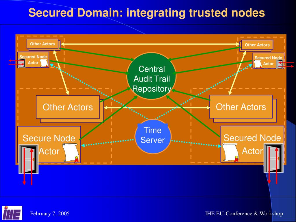 Secured Domain: integrating trusted nodes Other Actors Other Actors Other Actors Other Actors Secured Node Actor Central Audit TrailRepository Other Actors Other Actors Other Actors Other Actors TimeServer Secured Node Actor Secured Node Actor Secure Node Actor IHE EU-Conference & Workshop