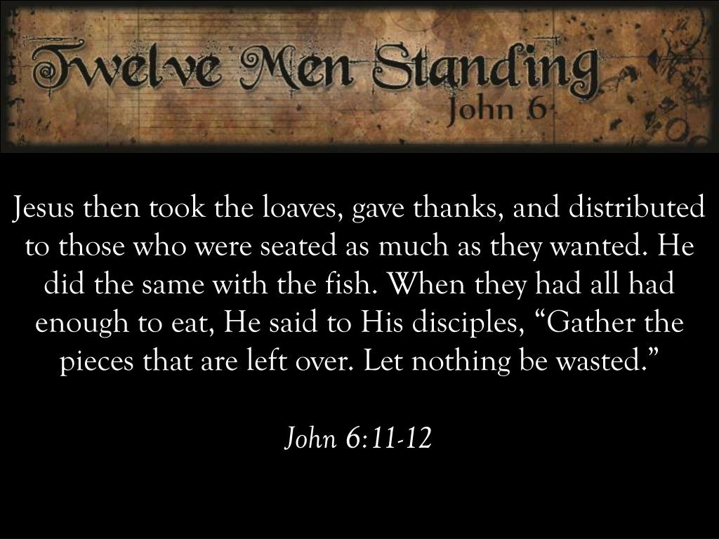 Jesus then took the loaves, gave thanks, and distributed to those who were seated as much as they wanted. He did the same with the fish. When they had all had enough to eat, He said to His disciples, “Gather the pieces that are left over. Let nothing be wasted.” John 6:11-12