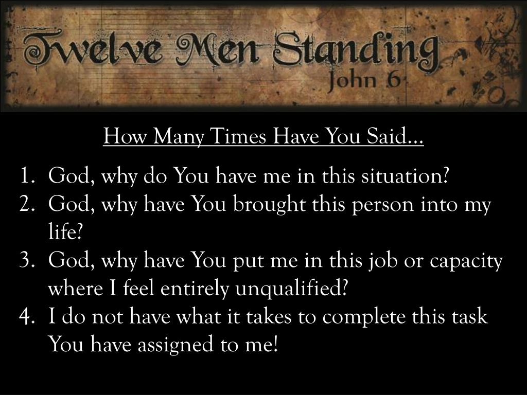 How Many Times Have You Said… • God, why do You have me in this situation? • God, why have You brought this person into my life? • God, why have You put me in this job or capacity where I feel entirely unqualified? • I do not have what it takes to complete this task You have assigned to me!