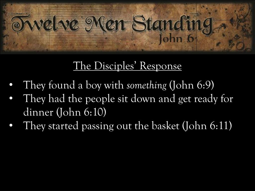 The Disciples’ Response • They found a boy with something(John 6:9) • They had the people sit down and get ready for dinner (John 6:10) • They started passing out the basket (John 6:11)