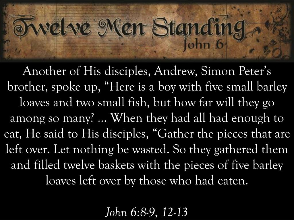 Another of His disciples, Andrew, Simon Peter’s brother, spoke up, “Here is a boy with five small barley loaves and two small fish, but how far will they go among so many? … When they had all had enough to eat, He said to His disciples, “Gather the pieces that are left over. Let nothing be wasted. So they gathered them and filled twelve baskets with the pieces of five barley loaves left over by those who had eaten. John 6:8-9, 12-13