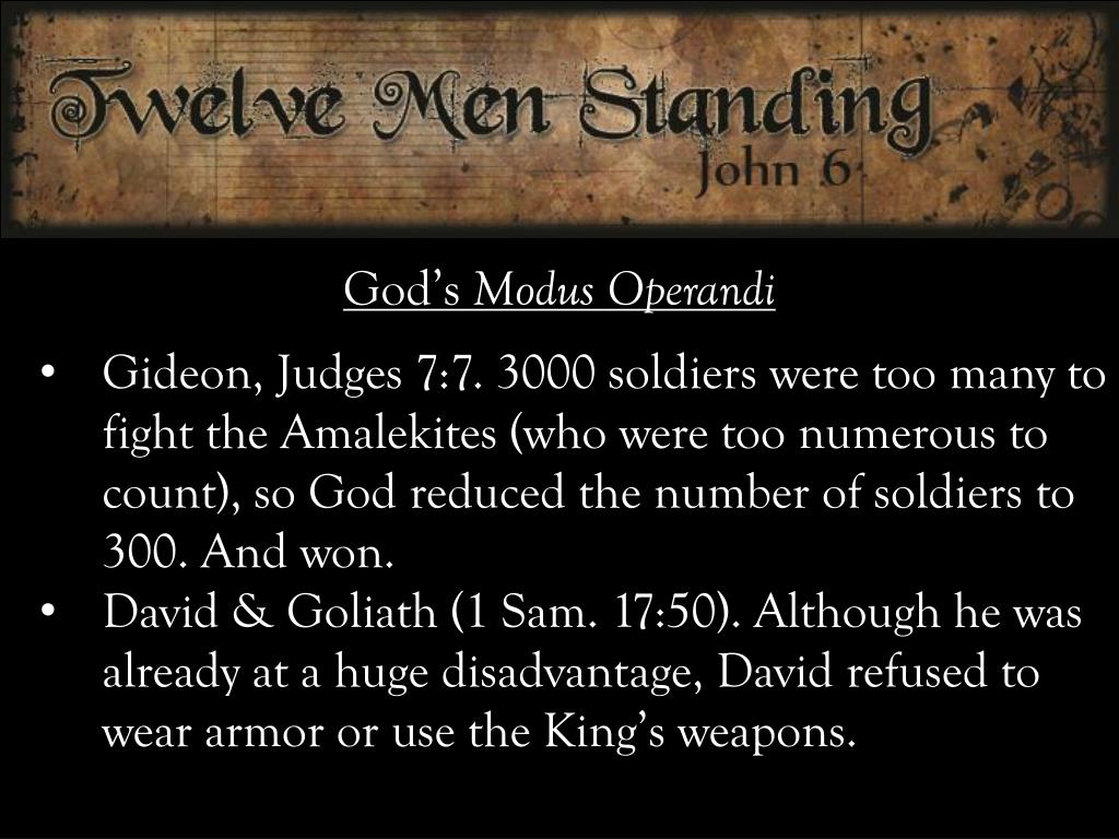 God’s Modus Operandi • Gideon, Judges 7:7. 3000 soldiers were too many to fight the Amalekites (who were too numerous to count), so God reduced the number of soldiers to 300. And won. • David & Goliath (1 Sam. 17:50). Although he was already at a huge disadvantage, David refused to wear armor or use the King’s weapons.