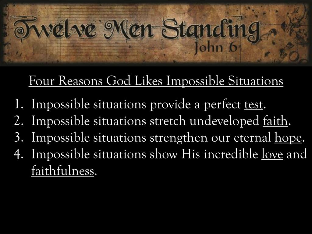 Four Reasons God Likes Impossible Situations • Impossible situations provide a perfect test. • Impossible situations stretch undeveloped faith. • Impossible situations strengthen our eternal hope. • Impossible situations show His incredible love and faithfulness.