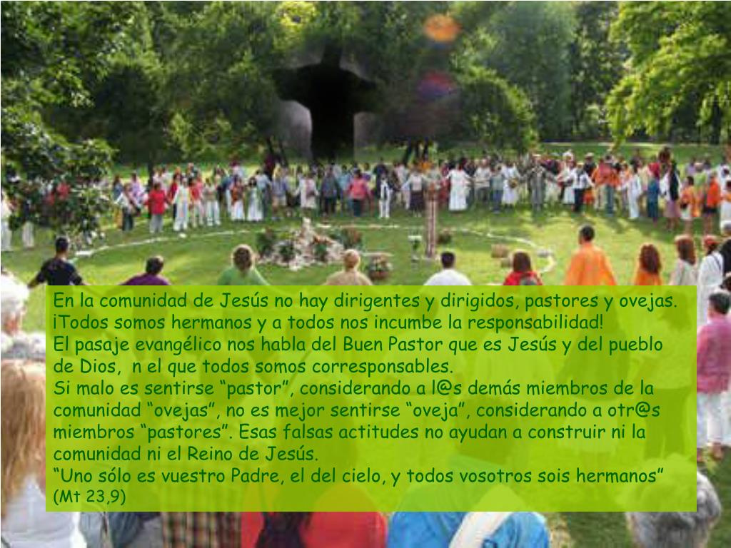 En la comunidad de Jesús no hay dirigentes y dirigidos, pastores y ovejas.¡Todos somos hermanos y a todos nos incumbe la responsabilidad!El pasaje evangélico nos habla del Buen Pastor que es Jesús y del pueblo de Dios, n el que todos somos corresponsables.Si malo es sentirse “pastor”, considerando a l@s demás miembros de la comunidad “ovejas”, no es mejor sentirse “oveja”, considerando a otr@s miembros “pastores”. Esas falsas actitudes no ayudan a construir ni la comunidad ni el Reino de Jesús.“Uno sólo es vuestro Padre, el del cielo, y todos vosotros sois hermanos” (Mt 23,9)