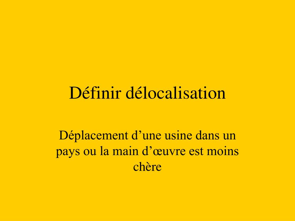 Définir délocalisation Déplacement d’une usine dans un pays ou la main d’œuvre est moins chère
