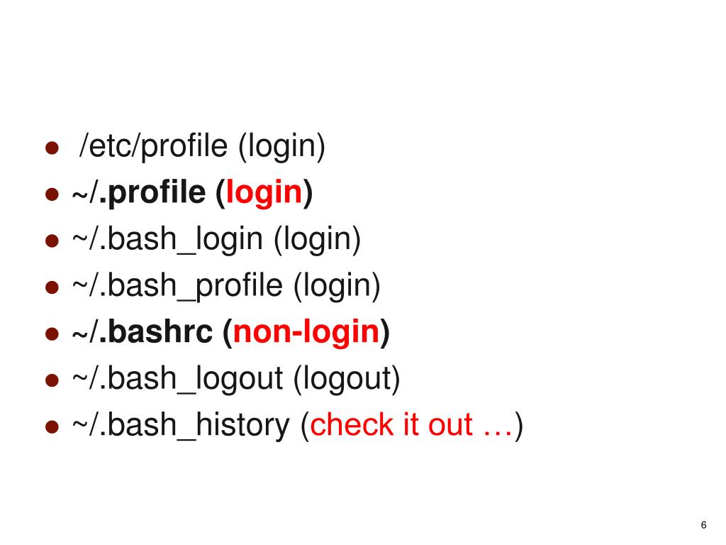 /etc/profile (login) ~/.profile (login) ~/.bash_login (login) ~/.bash_profile (login) ~/.bashrc (non-login) ~/.bash_logout (logout) ~/.bash_history (check it out …)