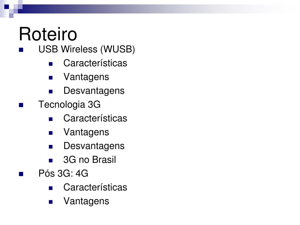 Roteiro • USB Wireless (WUSB) • Características • Vantagens • Desvantagens • Tecnologia 3G • Características • Vantagens • Desvantagens • 3G no Brasil • Pós 3G: 4G • Características • Vantagens